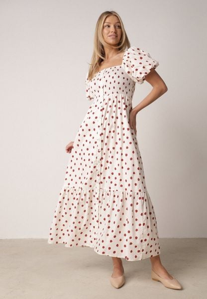 Beżowa Sukienka Bawełniana o Rozkloszowanym Kroju z Bufiastymi Rękawami w Groszki Lorairian