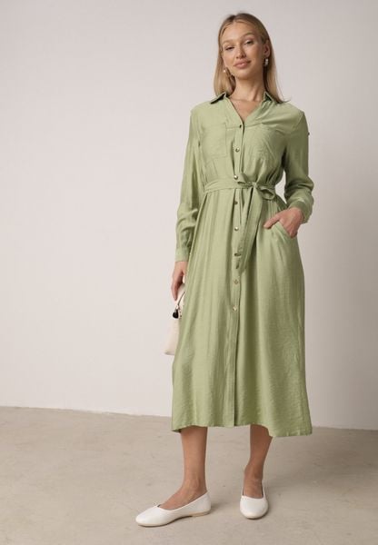 Zielona Sukienka Koszulowa z Wiskozą z Wiązanym Paskiem Lustilla