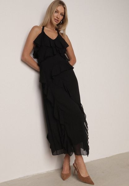Czarna Koktajlowa Sukienka Taliowana z Falbankami Wiązana na Szyi Demeina