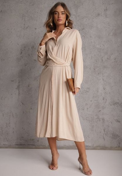 Beżowa Taliowana Sukienka z Wiskozą o Kroju Koszulowym z Guzikami i Paskiem Cosofia