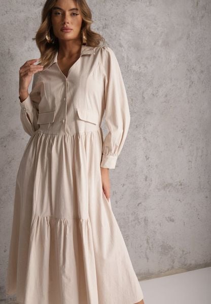 Beżowa Rozkloszowana Sukienka Koszulowa z Bawełny i Wiskozy Zdobiona Klapami Gleta