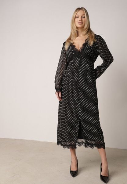 Czarna Sukienka w Kropki Ozdobiona Koronką i Przezroczystymi Rękawami Neanirae