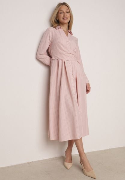 Różowa Koszulowa Sukienka z Wiskozy z Ozdobnym Marszczeniem w Talii Batena