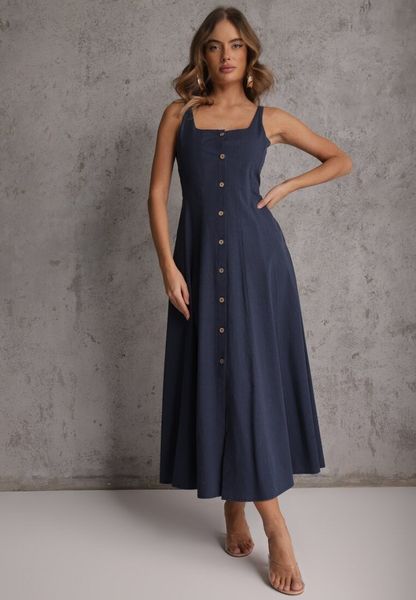 Granatowa Sukienka Rozkloszowana z Wiskozą i Bawełną Ozdobiona Guzikami Nikippe
