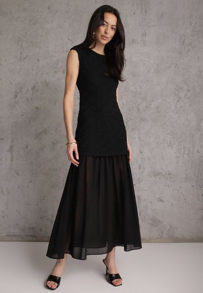 Czarna Sukienka Ażurowa z Usztywnioną Linią Ramion i Przezroczystym Dołem Semiriel