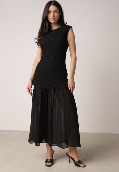 Czarna Sukienka Ażurowa z Usztywnioną Linią Ramion i Przezroczystym Dołem Semiriel
