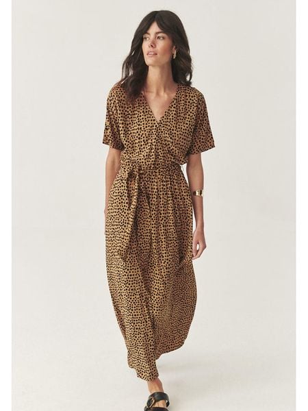 – czysta wiskoza- dekolt: V- szlufki na pasek: tak- zdejmowany pasek: tkanina- kieszenie: wpuszczane- krój: luźny- wzór: kropki