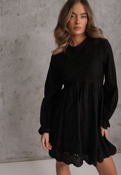 Czarna Rustykalna Sukienka z Bawełną Zdobiona Haftem i Ażurowymi Wycięciami Winlith