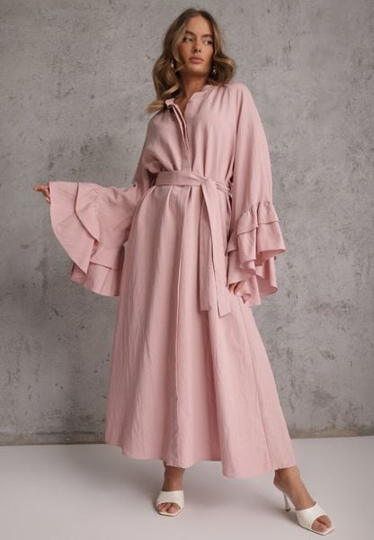 Różowa Koszulowa Sukienka z Wiskozy Ozdobiona Paskiem i Falbanami Tinethra