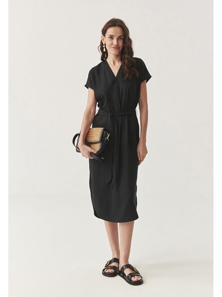 – czysty lyocell- dekolt: V- szlufki na pasek: tak- zdejmowany pasek: tkanina- dolny brzeg: zaokrąglony- krój: prosty- look: jednokolorowy