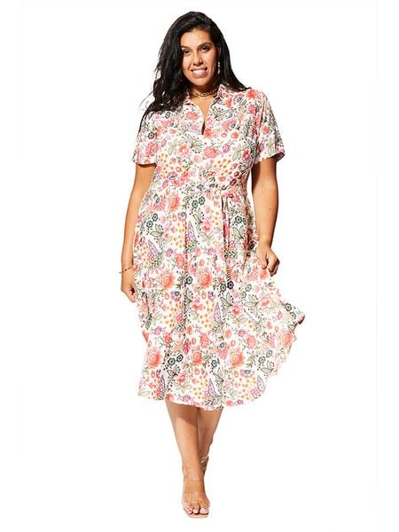 – czysta wiskoza- kołnierz: kent- dekolt: V- zapięcie: skrócona listwa guzikowa- zdejmowany pasek: tkanina- krój: litera A- wzór: kwiatowy