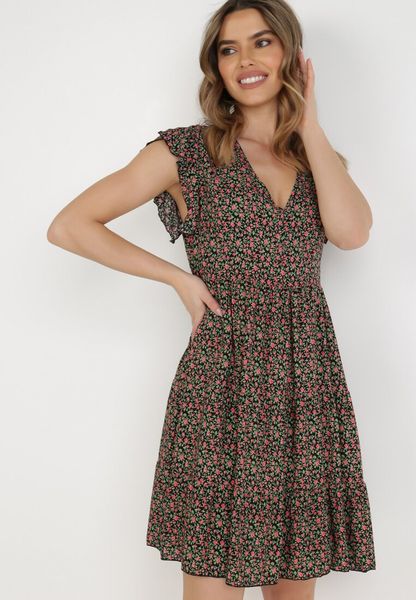 Czarna Wiskozowa Sukienka z Krótkim Rękawem i Marszczoną Górą w Drobne Kwiaty Oglemia
