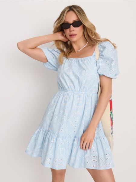Sinsay – Bawełniana sukienka mini z ażurowym wzorem – błękitny –