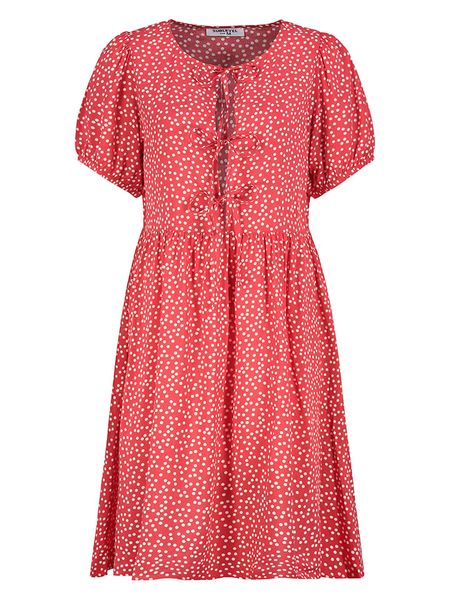 – czysta wiskoza- dekolt: okrągły- krój rękawów: bufiasty- detale: ozdobne wiązanie- krój: litera A- wzór: kropki