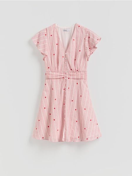 Sukienka o lekko rozkloszowanym kroju, wykonana z tkaniny z bawełną.