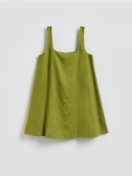 Sukienka o lekko rozkloszowanym kroju, wykonana z lnianej tkaniny.