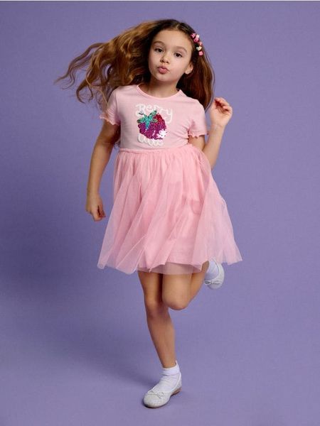 Sukienka z ozdobnymi cekinami wykończona tiulem – różowy