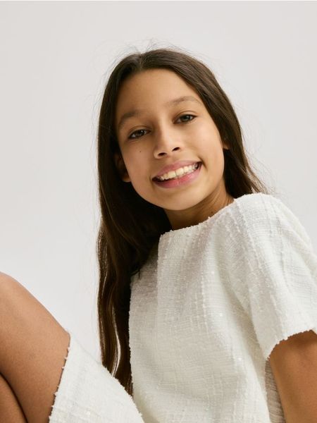 Tweedowa sukienka z cekinami – złamana biel