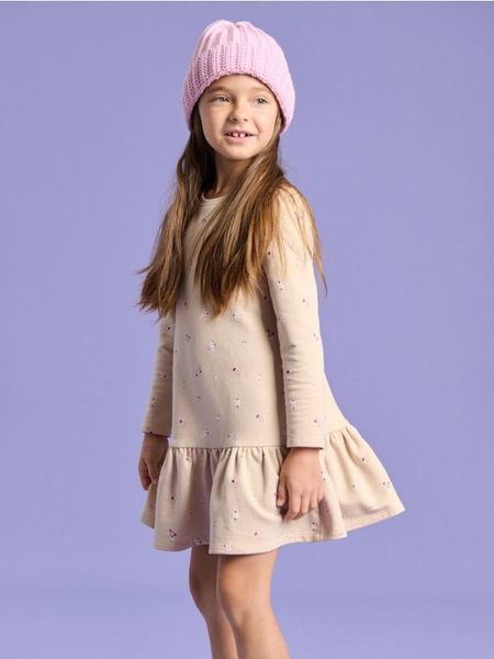 Sinsay – Sukienka z długim rękawem – beżowy – okrągły dekolt,długi rękaw,dół z falbanką,drobny wzór w kwiatki