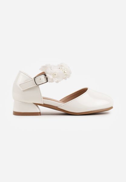 Białe Lakierowane Sandały na Niskim Obcasie z Kwiatkami i Perełkami Denagia