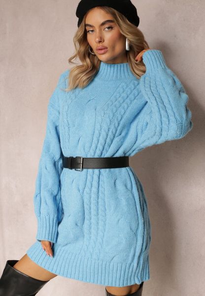 Niebieski Długi Sweter o Luźnym Kroju z Warkoczykowym Splotem Penerria