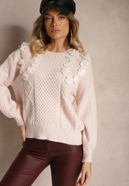 Różowy Klasyczny Sweter z Ozdobnymi Kwiatowymi Aplikacjami i Perełkami Leanwenna