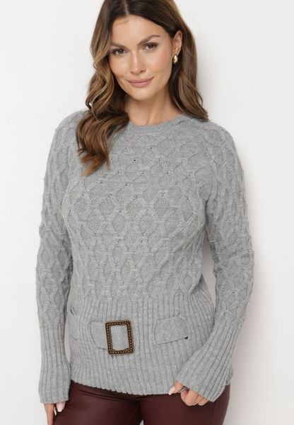 Szary Sweter z Ozdobnym Splotem z Paskiem i Klamrą Riean