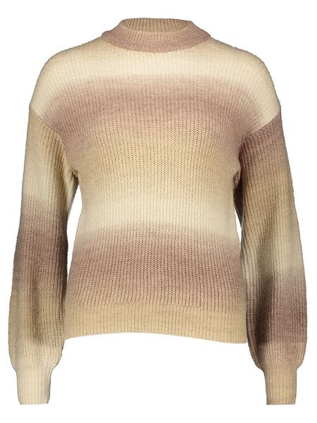 – z dodatkiem poliestru pochodzącego z recyclingu- z dodatkiem wełny- kołnierz: stójka- rękaw: bufiasty- ściągacz: kołnierz, zakończenia rękawów, dolny brzeg- krój: prosty- wzór splotu: luźny- wzór: przejście kolorów