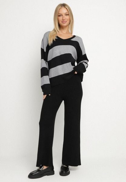 Szary Dzianinowy Komplet Szerokie Spodnie i Sweter w Paski Falesea