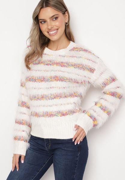 Biały Sweter o Włochatej Fakturze w Kolorowe Paski z Dzianiny z Wełną Rinzina