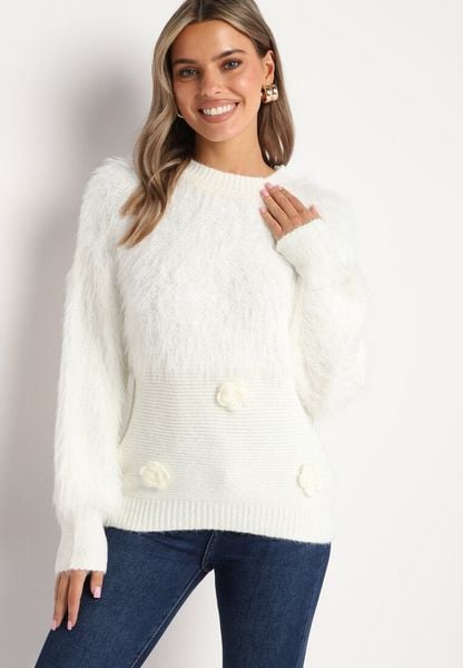 Biały Sweter Futrzany z Ozdobnymi Aplikacjami Kwiatkami i Dodatkiem Wełny Merilinas