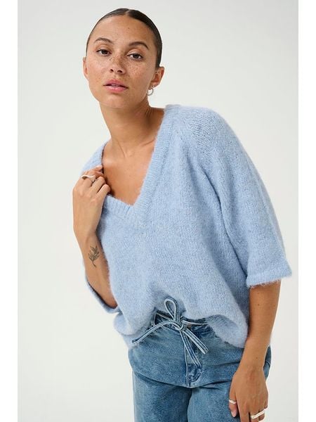 – z dodatkiem poliestru pochodzącego z recyklingu- z dodatkiem wełny- dekolt: V- długość rękawa: półdługi- ściągacz: dekolt, zakończenia rękawów, dolny brzeg- wzór splotu: luźny- krój: oversized- look: jednokolorowy