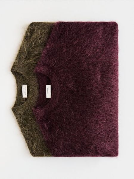 Sweter o swobodnym kroju, wykonany z dzianiny z wełną i moherem.