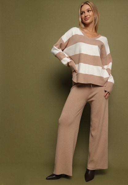 Beżowy Dzianinowy Komplet Szerokie Spodnie i Sweter w Paski Falesea