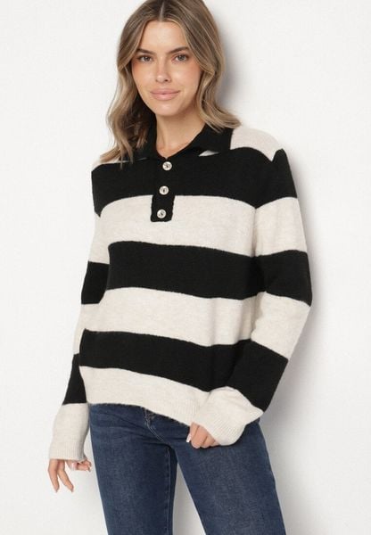 Czarny Sweter w Paski z Domieszką Wełny Zdobiony Kołnierzem i Guzikami Tisania