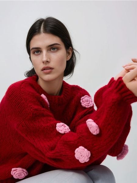 Sweter o swobodnym fasonie, wykonany z dzianiny z domieszką wełny.