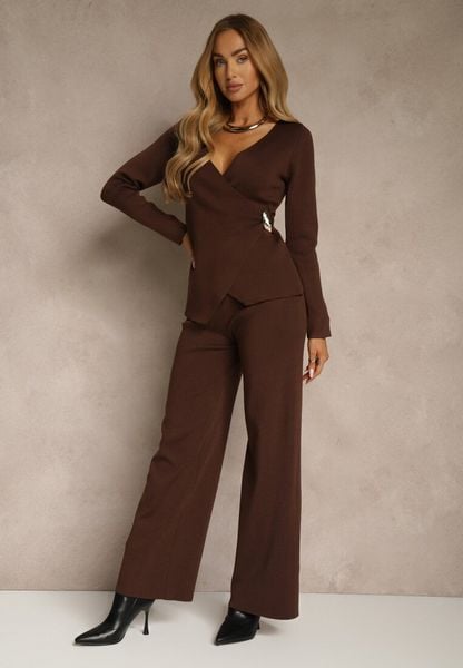 Brązowy Komplet z Wiskozą Kopertowy Sweter z Broszką i Szerokie Spodnie Esnna