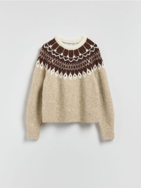 Sweter o swobodnym kroju, wykonany z dzianiny z dodatkiem wełny i domieszką alpaki.