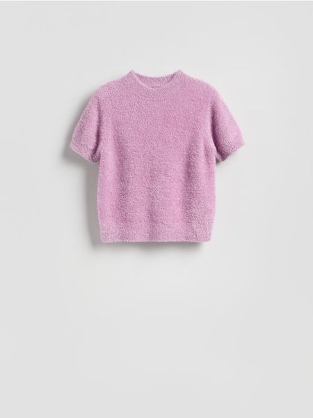 Sweter o prostym kroju, wykonany z dzianiny z metaliczną nitką.