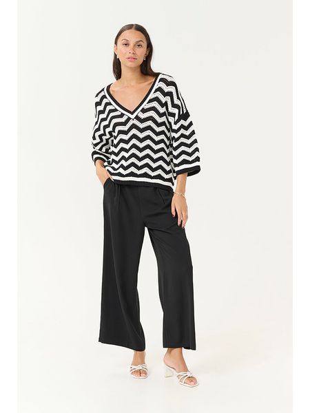 Sweter w szerokie pasy z dekoltem w serek i kołnierzykiem czarno-biały