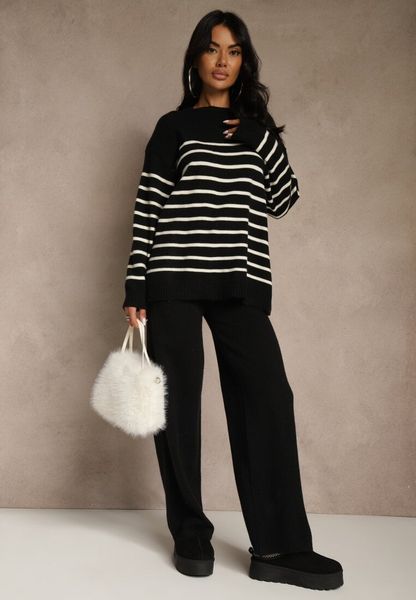 Czarny Komplet z Bawełną i Wełną Spodnie o Szerokim Kroju i Sweter w Paski Reimeia