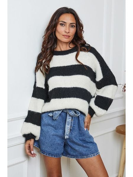 Sweter w szerokie pasy z dekoltem w serek i kołnierzykiem czarno-biały