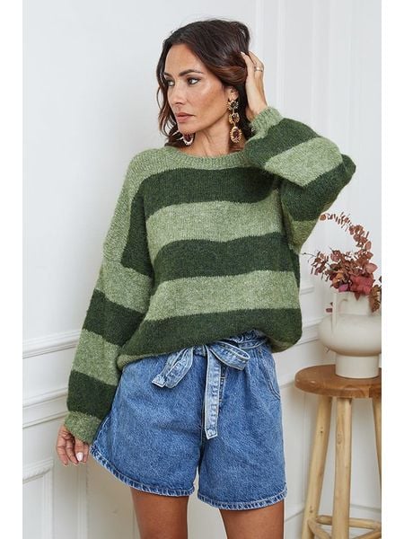 – z dodatkiem kaszmiru- dekolt: okrągły- rękaw: bufiasty- ściągacz: dekolt, zakończenia rękawów, dolny brzeg- krój: luźny- wzór: paski- wzór splotu: luźny