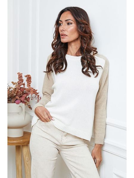 – z dodatkiem kaszmiru i wełny- dekolt: okrągły- ściągacz: dekolt, zakończenia rękawów, dolny brzeg- krój: prosty- wzór: colour blocking- wzór splotu: ścisły