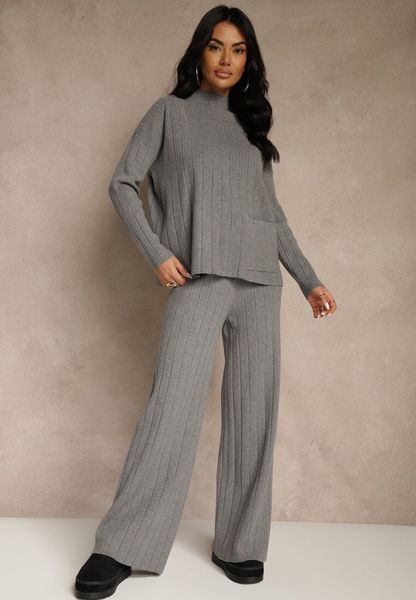 Szary Prążkowany Komplet Dzianinowy Szerokie Spodnie i Sweter z Półgolfem Fenitiva