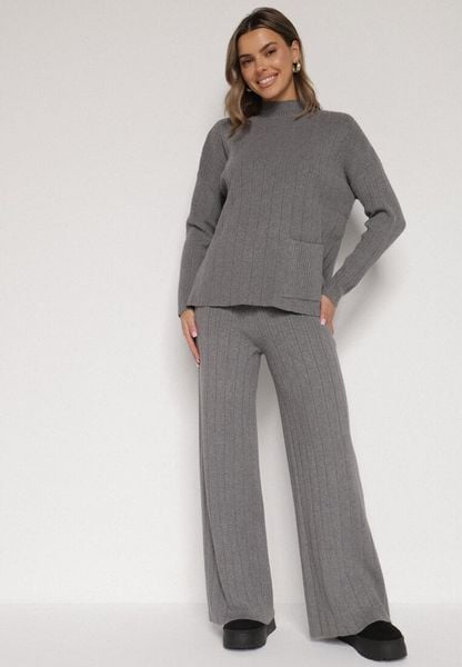Szary Komplet Dzianinowy Spodnie o Szerokim Kroju i Sweter Półgolf Datusa