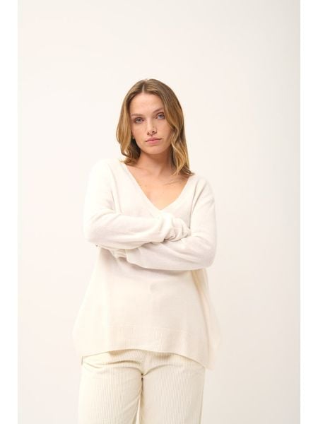 – czysty kaszmir- dekolt: V- ściągacz: dekolt, zakończenia rękawów, dolny brzeg- dolny brzeg: z rozcięciem- krój: oversized- look: jednokolorowyUwaga: Zaniżona rozmiarówka – ten produkt zalecamy zamawiać w rozmiarze o jeden numer większym niż zwykle.