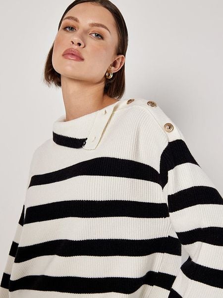 – kołnierz: drapowany- zapięcie: listwa guzikowa- krój rękawów: nietoperz- wzór splotu: luźny- krój: luźny- wzór: paski