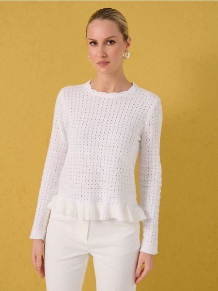 Ażurowy sweter z ozdobną falbanką – kremowy