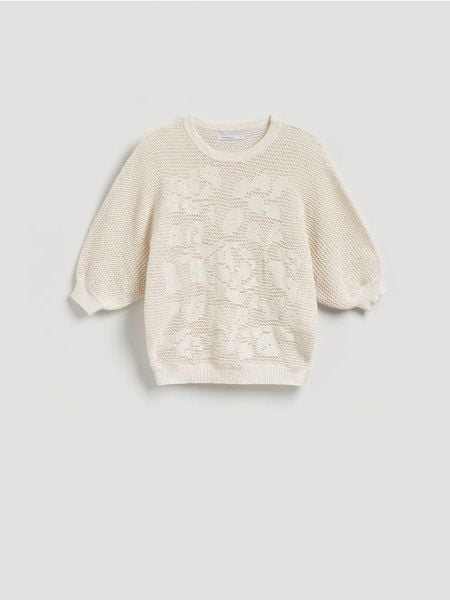 Sweter o swobodnym kroju, wykonany z dzianiny z bawełną.